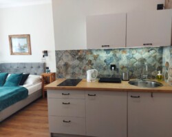 Każdy apartament posiada oddzielne wejście, łazienkę, taras lub balkon oraz w pełni wyposażony aneks kuchenny (sztućce, zastawa stołowa, garnki, lodówka, kuchenka indukcyjna). Apartamenty 3 i 4 osobowe posiadają dodatkowy pokój – sypialnię. To idealna opcja na nocleg dla rodzin z dziećmi lub grup znajomych.