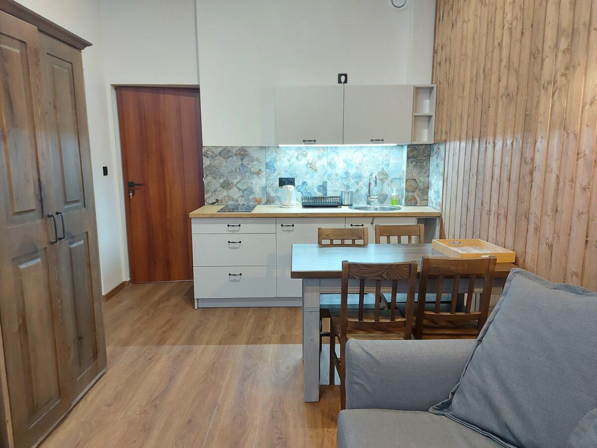 Każdy apartament posiada oddzielne wejście, łazienkę, taras lub balkon oraz w pełni wyposażony aneks kuchenny (sztućce, zastawa stołowa, garnki, lodówka, kuchenka indukcyjna). Apartamenty 3 i 4 osobowe posiadają dodatkowy pokój – sypialnię. To idealna opcja na nocleg dla rodzin z dziećmi lub grup znajomych.