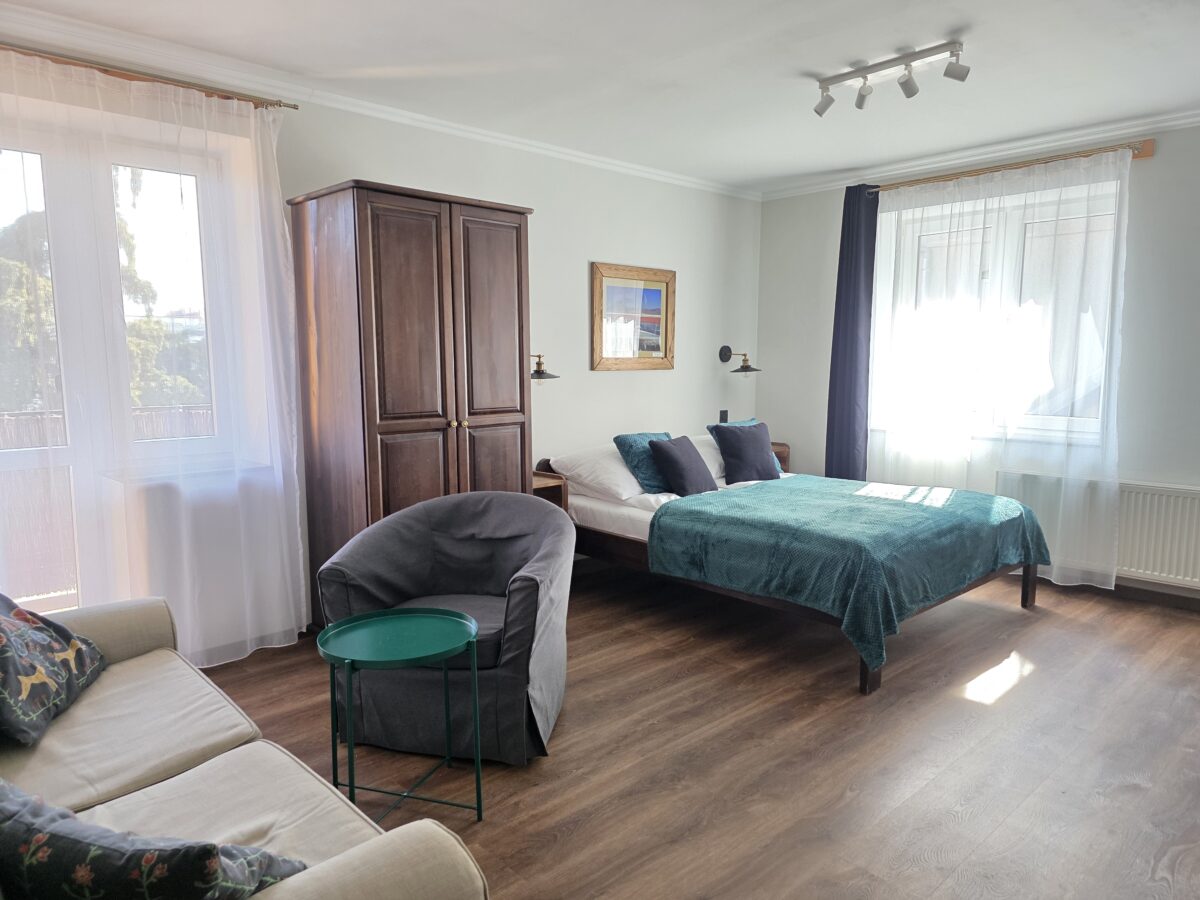 Pokój na piętrze, z własnym aneksem kuchennym, łazienką, balkonem, o powierzchni 26 m.